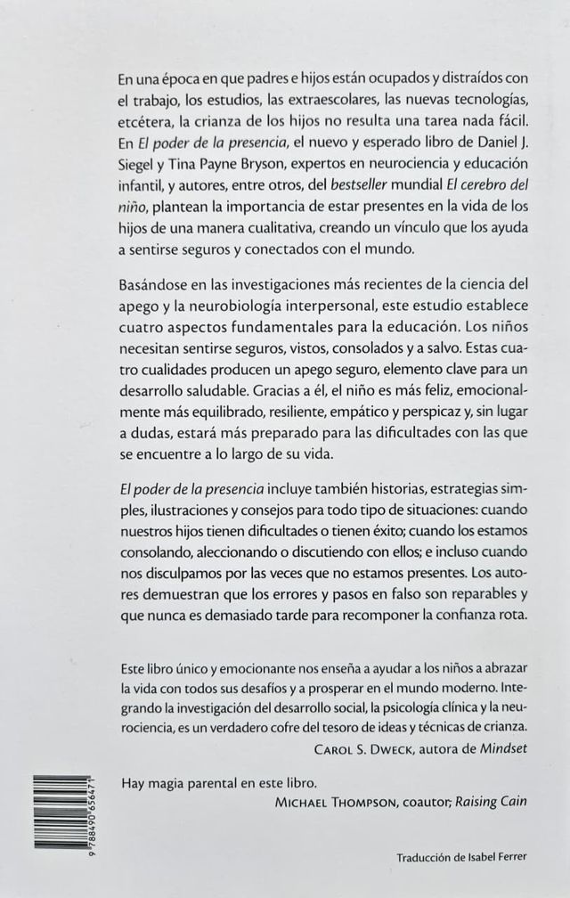 El poder de la presencia plantea una pregunta sencilla a la vez que crucial sobre la crianza de los hijos: ¿qué es lo más importante que una madre o un padre puede hacer para ayudar a sus hijos a salir adelante y a sentirse a gusto en el mundo? La respuesta de Daniel J. Siegel y Tina Payne Bryson, autores del bestseller mundial El cerebro del niño, es muy clara: debemos estar presentes en la vida de nuestros hijos. El poder de la presencia explica qué significa estar presente y cómo influye en los hijos para ser felices, estar sanos y tener éxito en la vida y en las relaciones personales.
